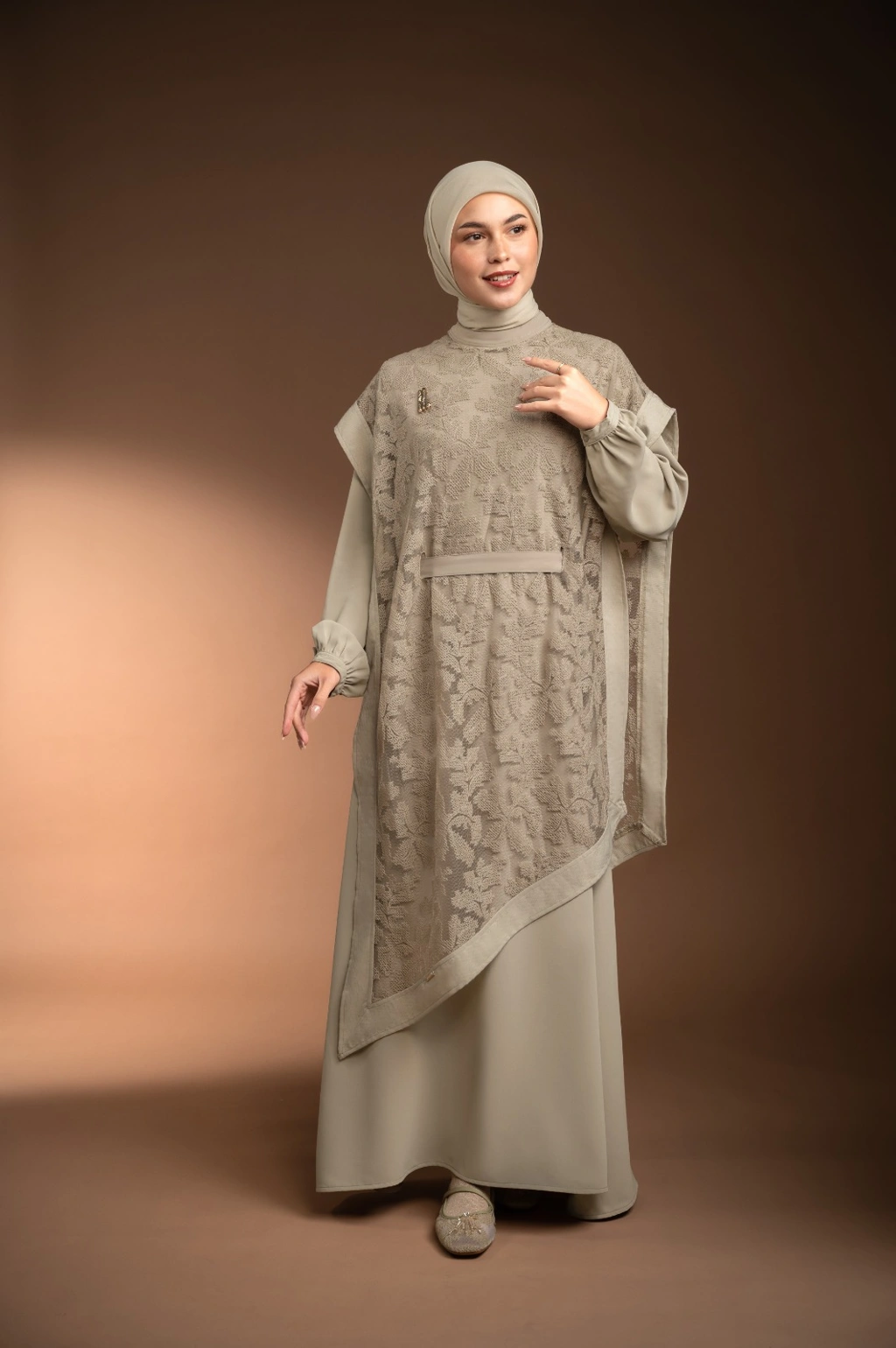Dress berbahan flowy dikombinasikan dengan bahan brokat flowy premium & bahan polos bertekstur.