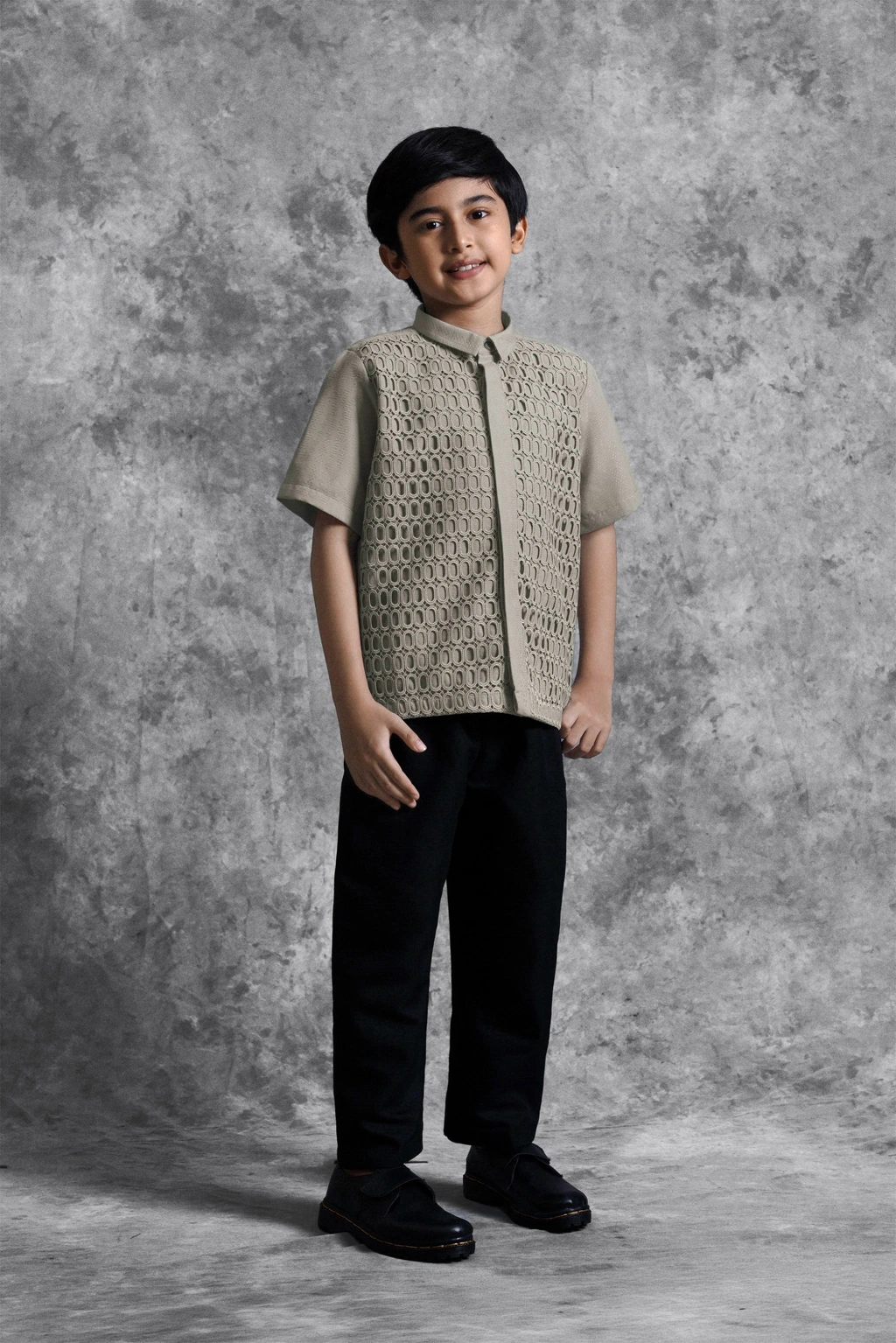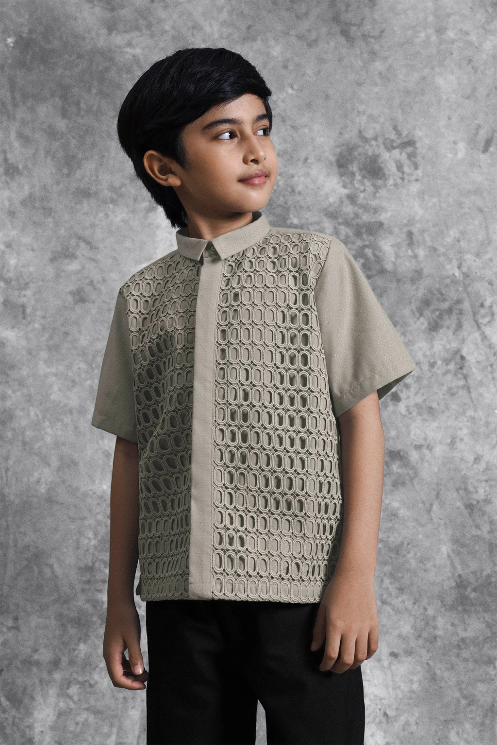 Kemeja anak ini hadir dengan potongan Regular Formal Fit yang dirancang khusus untuk kenyamanan anak-anak. Kemeja ini menonjolkan detail Lace Embroidery berbentuk oval yang tersusun presisi, menciptakan tekstur mewah yang unik pada bagian depan. Fitur Hidden Button memberikan kesan clean dan minimalis, menjadikan detail brukat sebagai pusat perhatian yang elegan. Pilihan sempurna untuk anak-anak tampil beda dan eksklusif dengan balutan craftsmanship modern di momen spesial bersama keluarga.