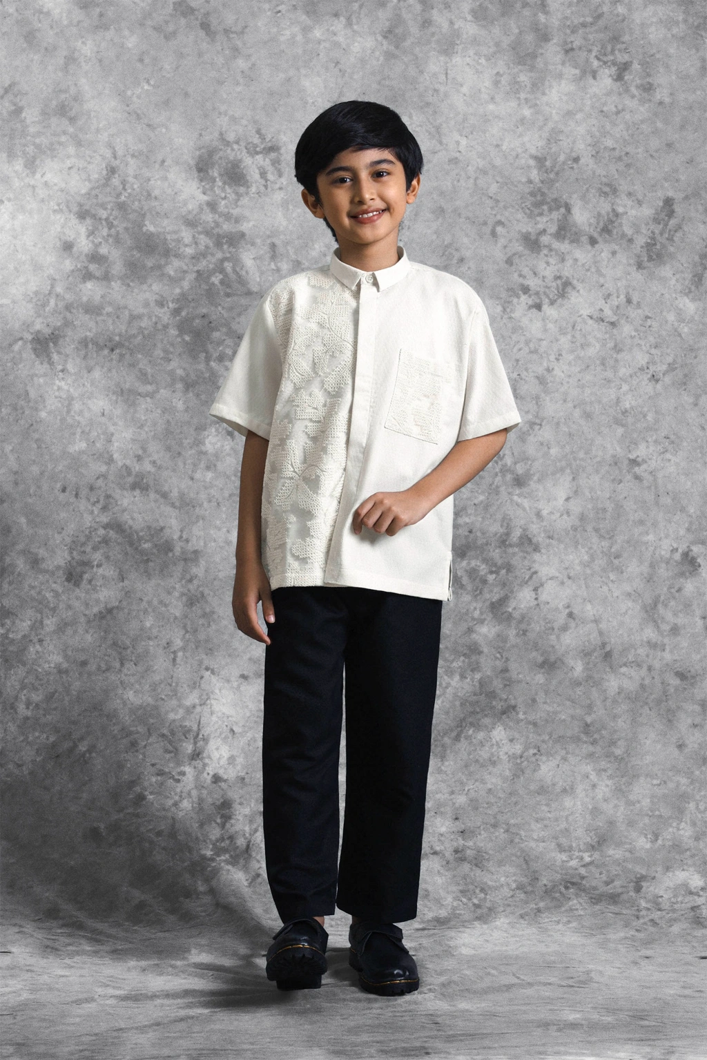 Kemeja anak ini dirancang dengan potongan Reguler Formal yang memberikan siluet rapi dan proposional. Kemeja ini memberikan sisi tegas melalui desain Asimetris yang dilapisi Brokat dengan sentuhan modern yang unik. Penggunaan Hidden Button memastikan tampilan depan menjadi clean dan minimalis, sementara detail patch pocket di dada kiri dan lengan pendek memperkuat karakter eksklusifnya. Kemeja ini sangat cocok untuk acara formal maupun momen spesial bersama keluarga.