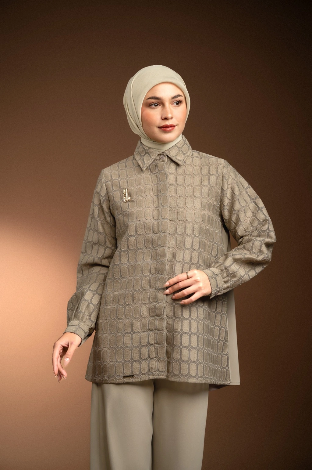 Kemeja dari kombinasi brokat organza premium dan bahan flowy twill memberikan tampilan mewah namun tetap nyaman.