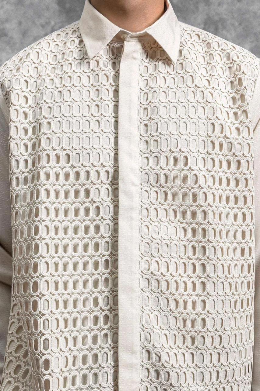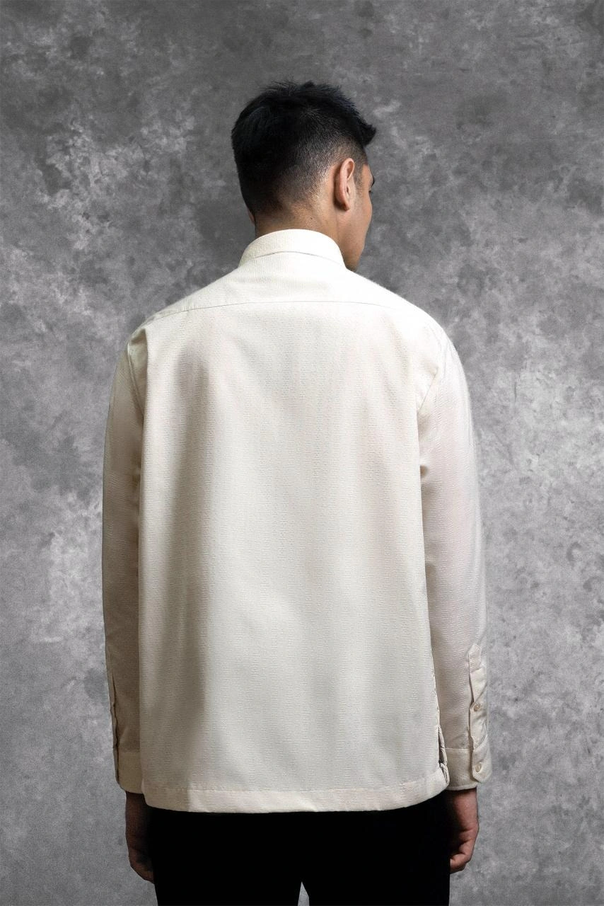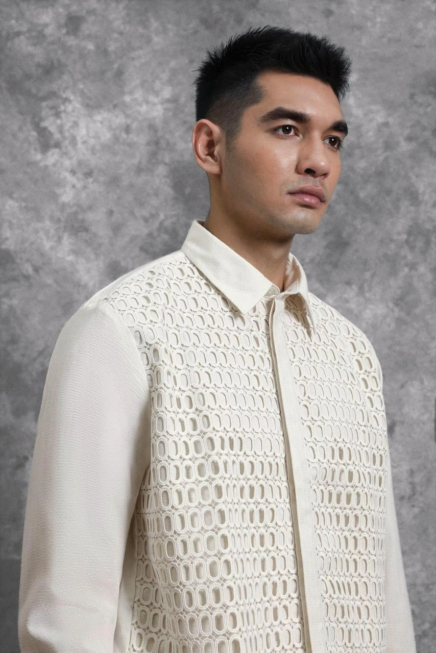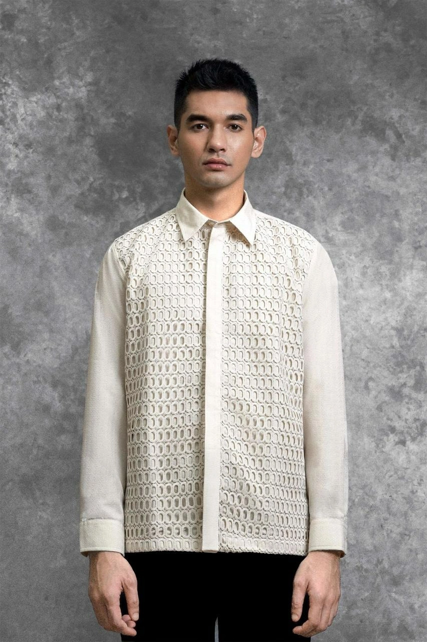 Kemeja ini hadir dengan potongan Regular Formal Fit . Menghadirkan perpaduan unik panel Lace Embroidery berdesain shape oval yang tersusun presisi pada bagian badan depan. Penggunaan Hidden Button menciptakan tampilan depan yang seamless dan minimalis, memberikan ruang bagi detail brukat untuk tampil sebagai centerpiece yang mewah. Dengan lengan panjang bermanset rapi, kemeja ini dirancang khusus bagi yang ingin tampil eksklusif dan berbeda dalam balutan craftsmanship yang modern.