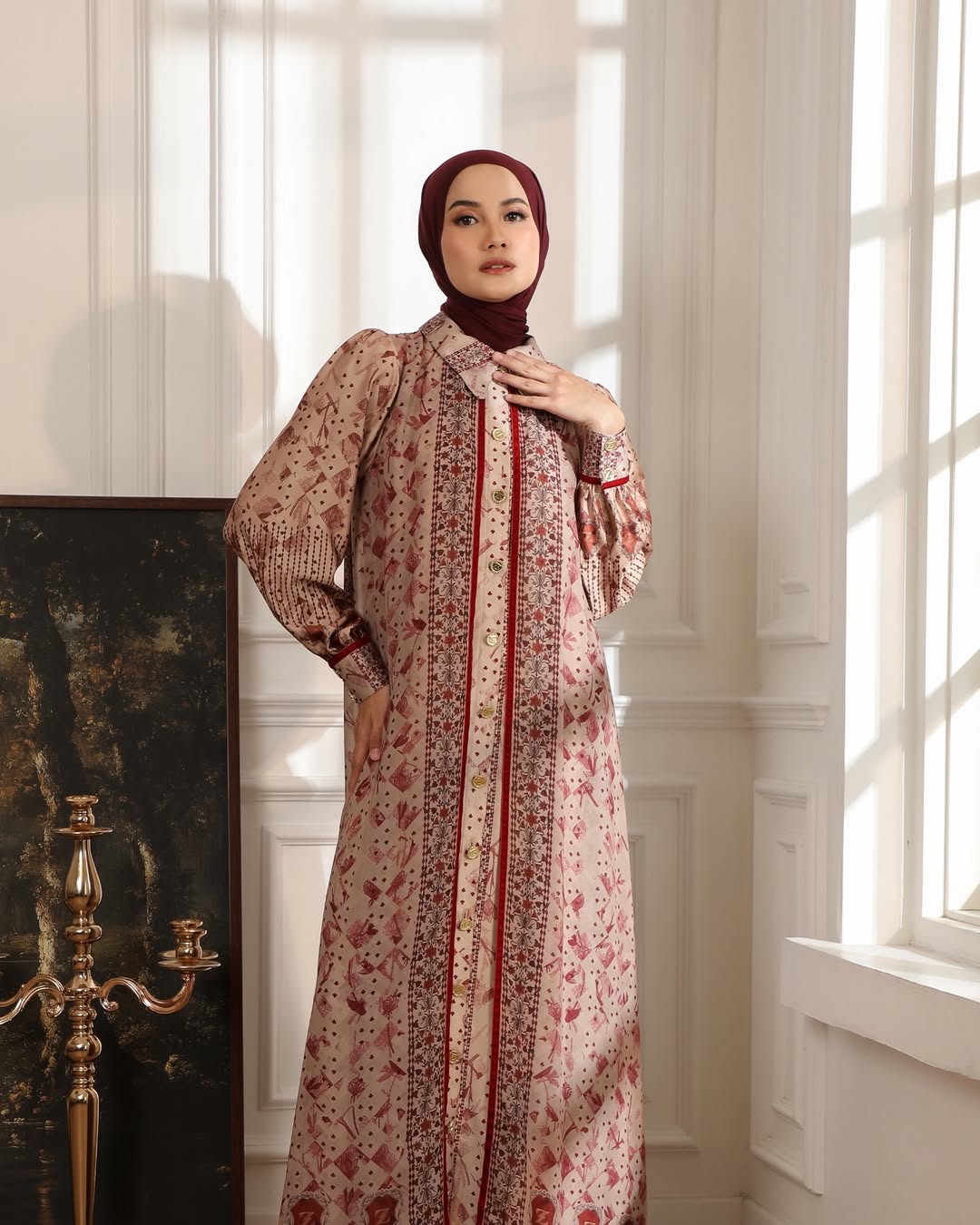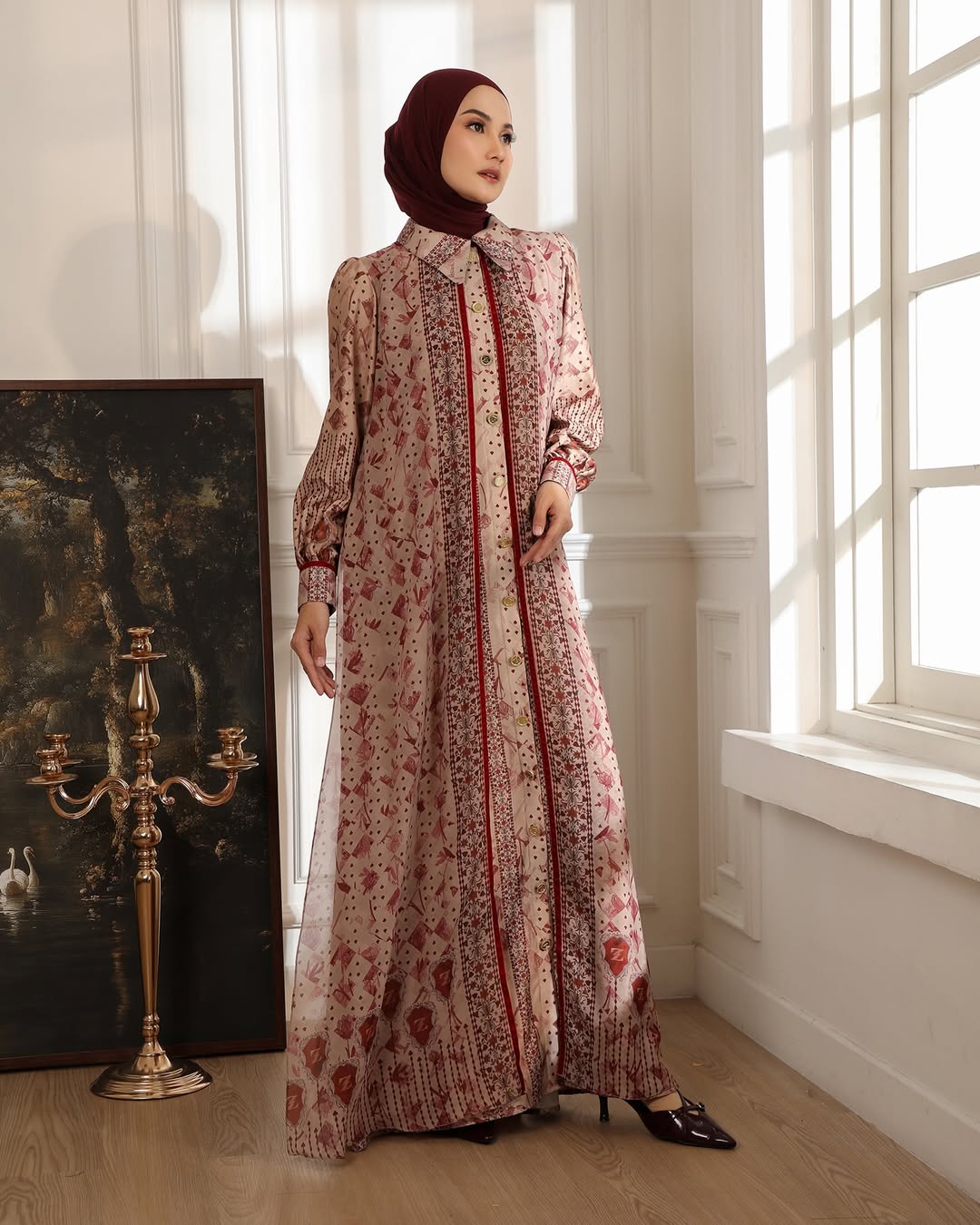 Perpaduan dua material berbeda—textured silk yang mewah dan chiffon yang jatuh—menciptakan tampilan yang anggun sekaligus nyaman untuk berbagai acara spesial.