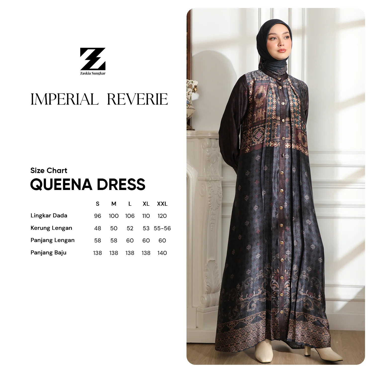 Hadir sebagai long dress dengan potongan lurus lebar (A-line jatuh) yang anggun saat dikenakan. Dilengkapi lengan puff dengan manset untuk memberi volume dan aksen feminin, serta detail tali pada bagian leheryang dapat divariasikan sesuai gaya.