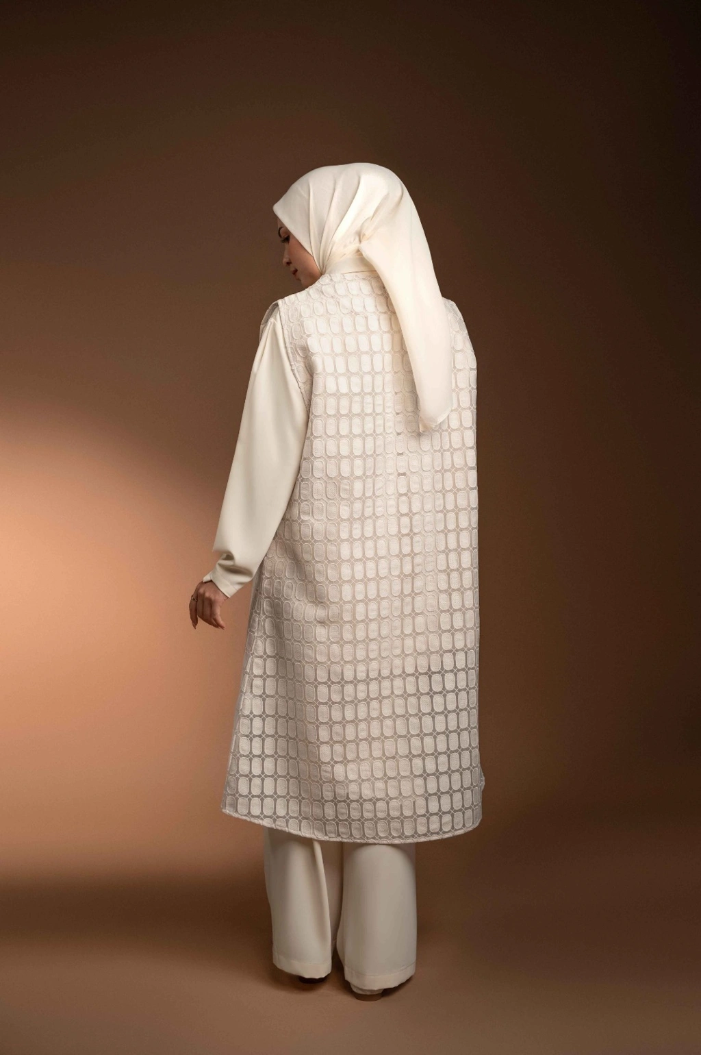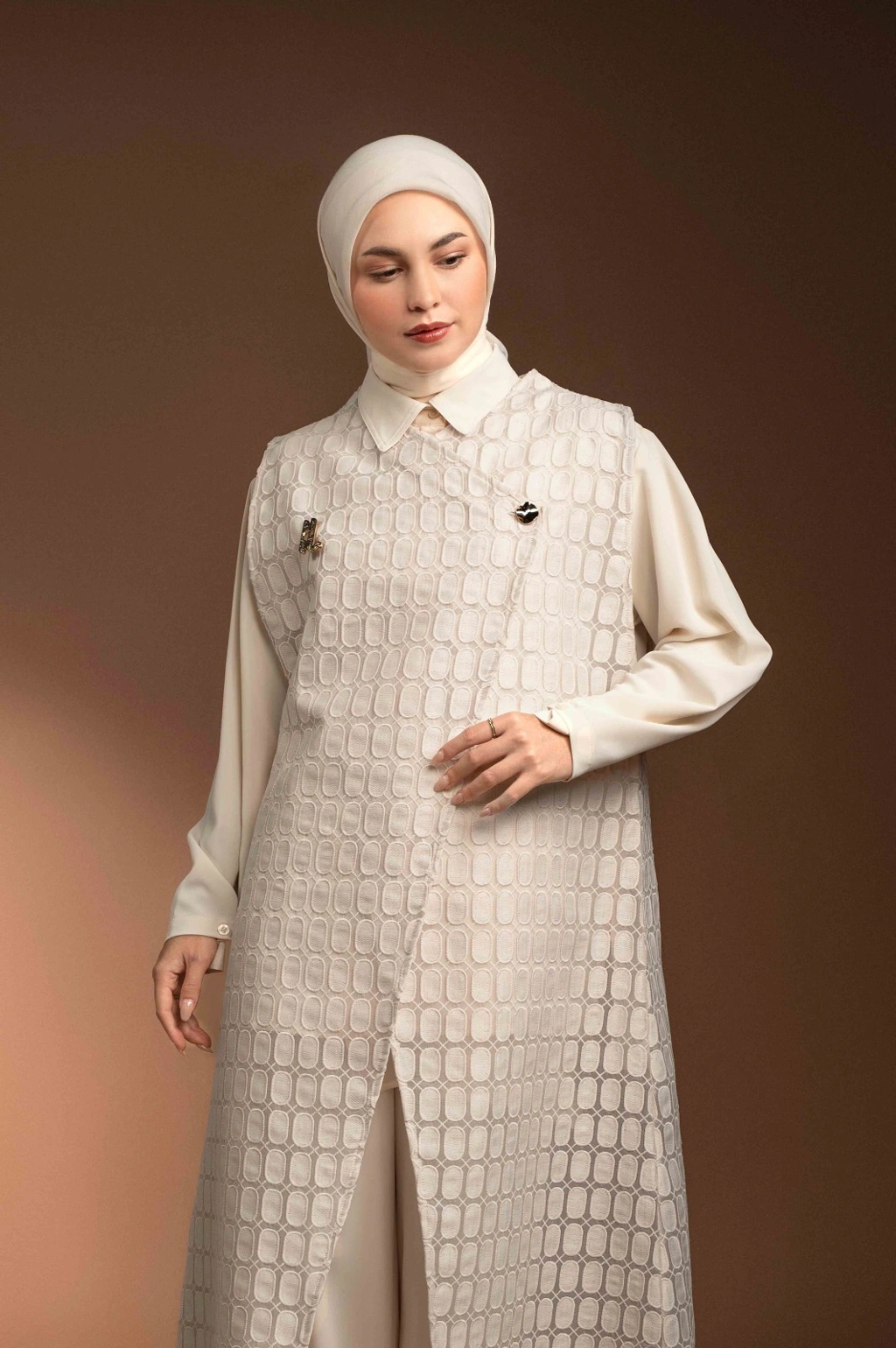Vest panjang berbahan brokat organza premium menghadirkan tampilan classy yang easy-to-wear.
