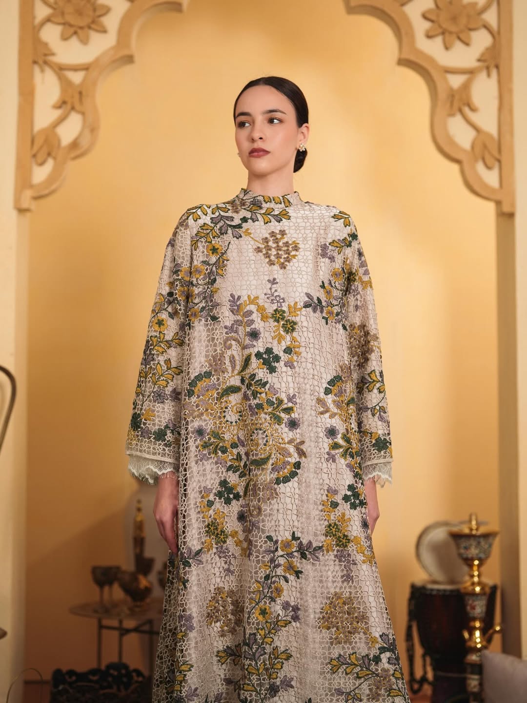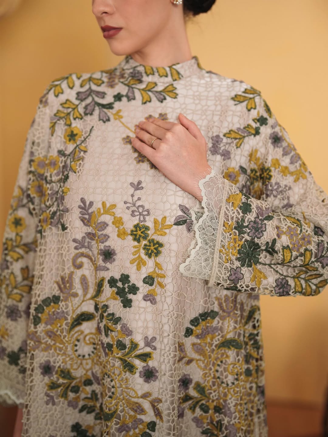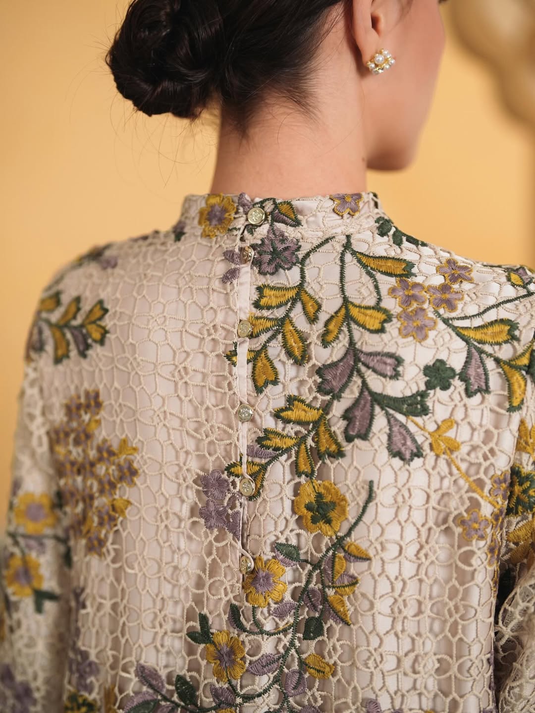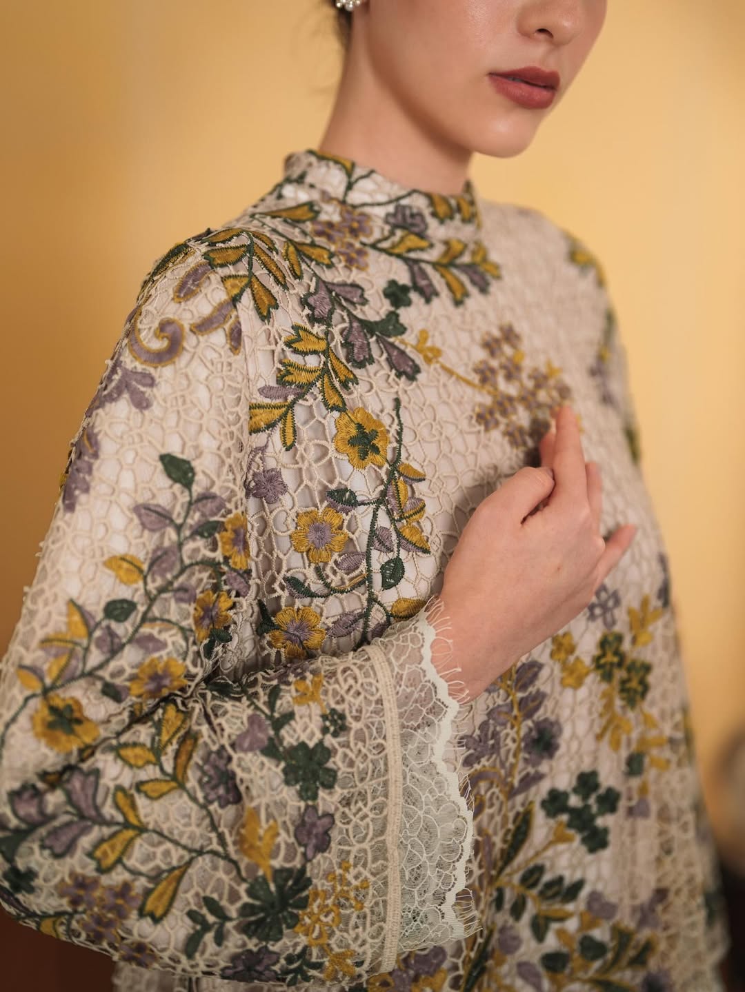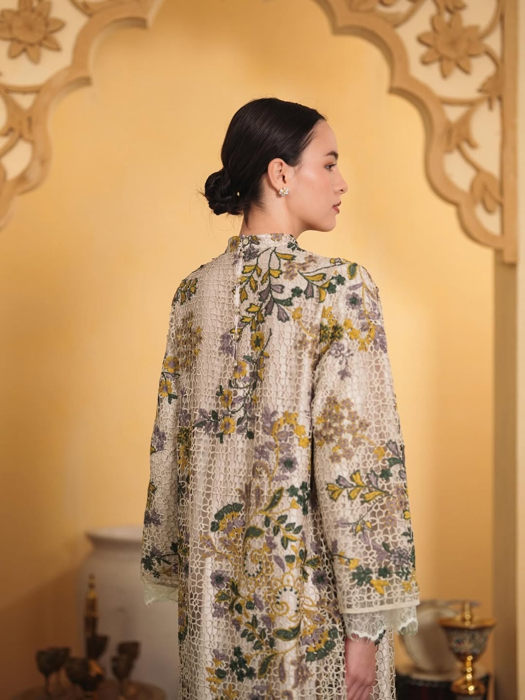 Lace Long Dress yang dirancang dengan siluet A-line yang jatuh cantik mengikuti bentuk tubuh. Detail kerah bulat memberikan kesan klasik dan timeless serta double layer flare sleeve menambah sentuhan feminin yang manis. Bagian belakang dilengkapi kancing tersembunyi yang memudahkan pemakaian. Keistimewaan dress ini terletak pada double full lace dengan kombinasi motif berbeda yang kontras, menciptakan tampilan yang kaya tekstur, mewah, dan eksklusif.